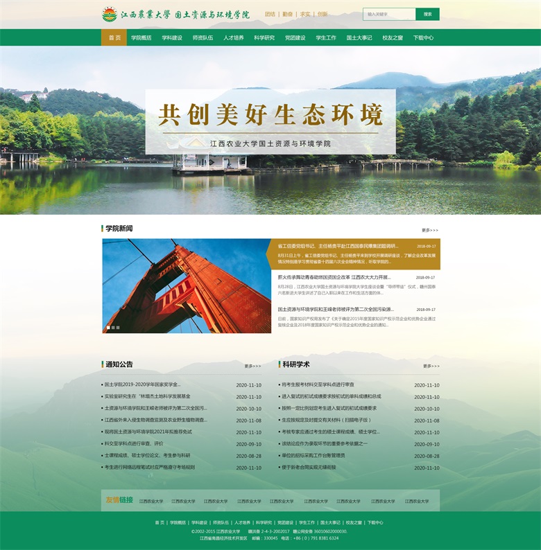 江西農(nóng)業(yè)大學(xué)國土資源與環(huán)境學(xué)院辦學(xué)歷史悠久,最早可追溯到1940年中正大學(xué)的土壤學(xué)和農(nóng)業(yè)化學(xué)學(xué)科,1997年由原資源與環(huán)境系、環(huán)保系和土管系合并而成。學(xué)院下設(shè)黨委行政辦公室、學(xué)生工作辦公室、教學(xué)管理辦公室和資料室等4個服務(wù)部門,農(nóng)業(yè)資源與環(huán)境系、環(huán)境科學(xué)與工程系、農(nóng)業(yè)水利工程系、土地資源管理系和旅游管理系等5個教學(xué)單位,以及江西省鄱陽湖流域農(nóng)業(yè)資源與生態(tài)重點實驗室、南昌市景觀與環(huán)境重點實驗室、江西農(nóng)業(yè)大學(xué)農(nóng)業(yè)資源與環(huán)境實驗教學(xué)示范中心、土地資源管理實驗室、資源環(huán)境遙感與信息實驗室和江西農(nóng)業(yè)大學(xué)土地科學(xué)研究所等6個教學(xué)與科研平臺。 學(xué)院擁有一支初具規(guī)模、結(jié)構(gòu)合理且?guī)煹聡?yán)謹(jǐn)、學(xué)術(shù)優(yōu)良的師資隊伍。截止2017年8月,學(xué)院現(xiàn)有教職工83人,專任教師61人,其中教授15人,副教授22人,博士生導(dǎo)師6人,博士43人。全國模范教師1 人、享受國務(wù)院政府特殊津貼者2人、“贛鄱英才555 工程”領(lǐng)軍人才2人、江西省優(yōu)秀教師1 人、江西省高等學(xué)校中青年學(xué)科帶頭人6人,江西省新世紀(jì)百千萬人才工程第一、二層次人選5名。同時,對外聘請客座和兼職教授8人。 學(xué)院在強(qiáng)化基礎(chǔ)研究和應(yīng)用基礎(chǔ)研究的基礎(chǔ)上,不斷拓展應(yīng)用研究和社會服務(wù)工作。近年來,承擔(dān)國家自然科學(xué)基金項目、國家社會科學(xué)基金項目、國家“973”子項目、“十三五”國家重點研發(fā)計劃項目、省部級及市(廳)級各類課題318項,發(fā)表論文346篇,出版著作16部,獲國家級、省部級等科技獎勵23項,獲專利8項,其中一大批科技成果在社會上得以廣泛應(yīng)用,取得良好的經(jīng)濟(jì)效益、社會效益和生態(tài)效益。 雅騰科技根據(jù)學(xué)院的具體需求,進(jìn)行量身定制設(shè)計、采用寬屏布局、簡潔、大氣、上檔次。 (江西農(nóng)業(yè)大學(xué)國土資源與環(huán)境學(xué)院網(wǎng)站首頁設(shè)計效果圖) 雅騰科技專注企業(yè)網(wǎng)站建設(shè)、微信小程序、軟件系統(tǒng)、公眾號定制開發(fā),有專業(yè)的技術(shù)團(tuán)隊,為企業(yè)提供高性價比的技術(shù)開發(fā)支持服務(wù)。